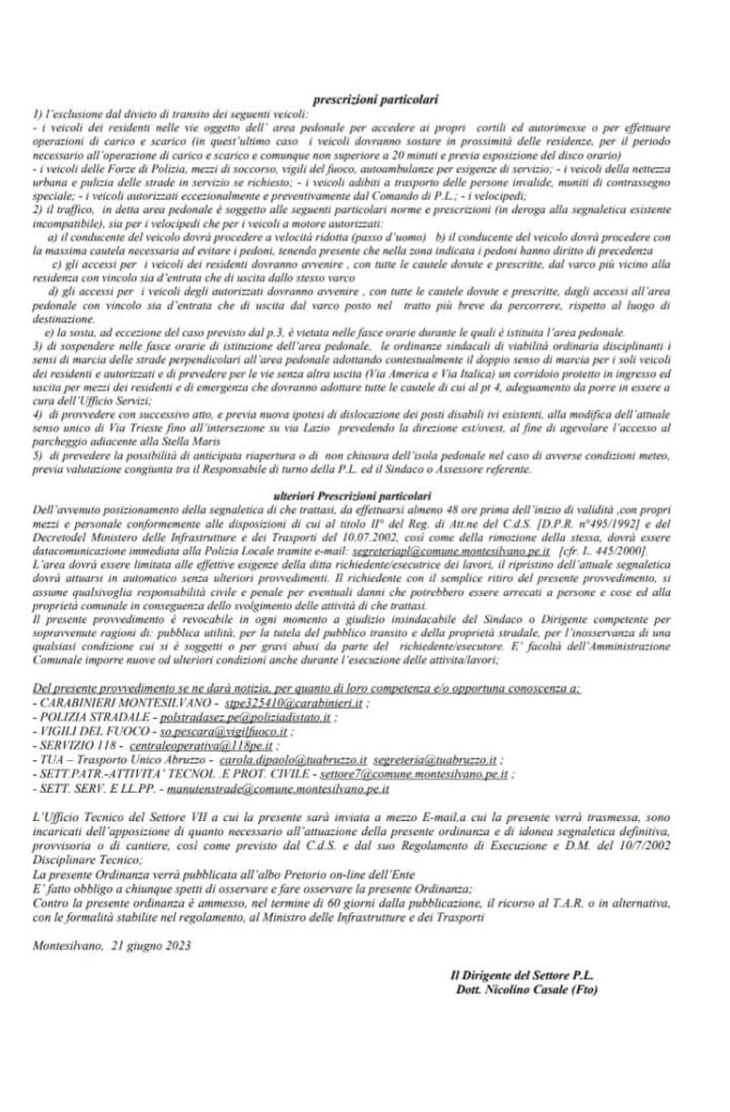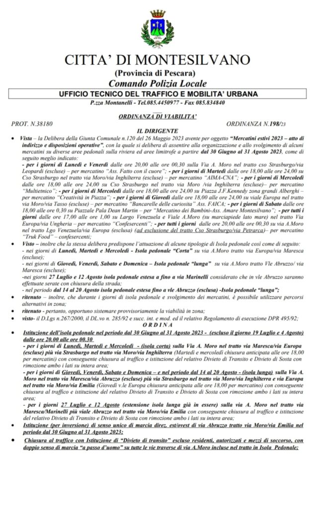 DAL 30 GIUGNO AL 31 AGOSTO L’ISOLA PEDONALE INSISTERA’ SU UN TRATTO DI VIA ALDO MORO – DALLE ORE 20.00 ALLE ORE 00.30 (AD ESCLUSIONE DEL 19 LUGLIO E DEL 4 AGOSTO).NELLO SPECIFICOPer i giorni di LUNEDI’ – MARTEDI’ e MERCOLEDI’ – ISOLA CORTA su Via A. Moro nel tratto via Maresca/via Europa (escluse) più via Strasburgo nel tratto via Moro/via Inghilterra.Martedì e mercoledì CHIUSURA ANTICIPATA ALLE ORE 18,00 per mercatini con conseguente chiusura al traffico e istituzione del relativo Divieto di Transito e Divieto di Sosta con rimozione ambo i lati su intera area;Per i giorni di GIOVEDI’, VENERDI’, SABATO e DOMENICA – e nel periodo dal 14 al 20 Agosto – ISOLA LUNGA su Via A. Moro, nel tratto via Maresca/via Abruzzo (escluse) più via Strasburgo nel tratto via Moro/via Inghilterra e via Europa nel tratto via Moro/via Emilia.GIOVEDI’ v.le Europa CHIUSURA ANTICIPATA ALLE ORE 18,00 per mercatino, con conseguente chiusura al traffico e istituzione del relativo Divieto di Transito e Divieto di Sosta con rimozione ambo i lati su intera area;Per i giorni 27 LUGLIO e 12 AGOSTO, ESTENSIONE ISOLA LUNGA (già in essere) sulla via A. Moro, nel tratto via Maresca/Marinelli più viale Abruzzo, nel tratto via Moro/via Emilia con conseguente chiusura al traffico e istituzione del relativo Divieto di Transito e Divieto di Sosta con rimozione ambo i lati su intera area.Dal 30 GIUGNO al 31 AGOSTO, L’ORDINANZA di VIABILITA’ n.198, sottoscritta dal Comandante della Polizia Locale Nicolino Casale, segnala inoltre L’ISTITUZIONE (per inversione) DI SENSO UNICO DI MARCIA DIREZIONE EST/OVEST di via Abruzzo tratto via Moro/via Emilia e la chiusura al traffico con Istituzione di “Divieto di transito” escluso residenti, autorizzati e mezzi di soccorso, con doppio senso di marcia “a passo d’uomo” su tutte le vie traverse di via A. Moro incluse nel tratto in Isola Pedonale.