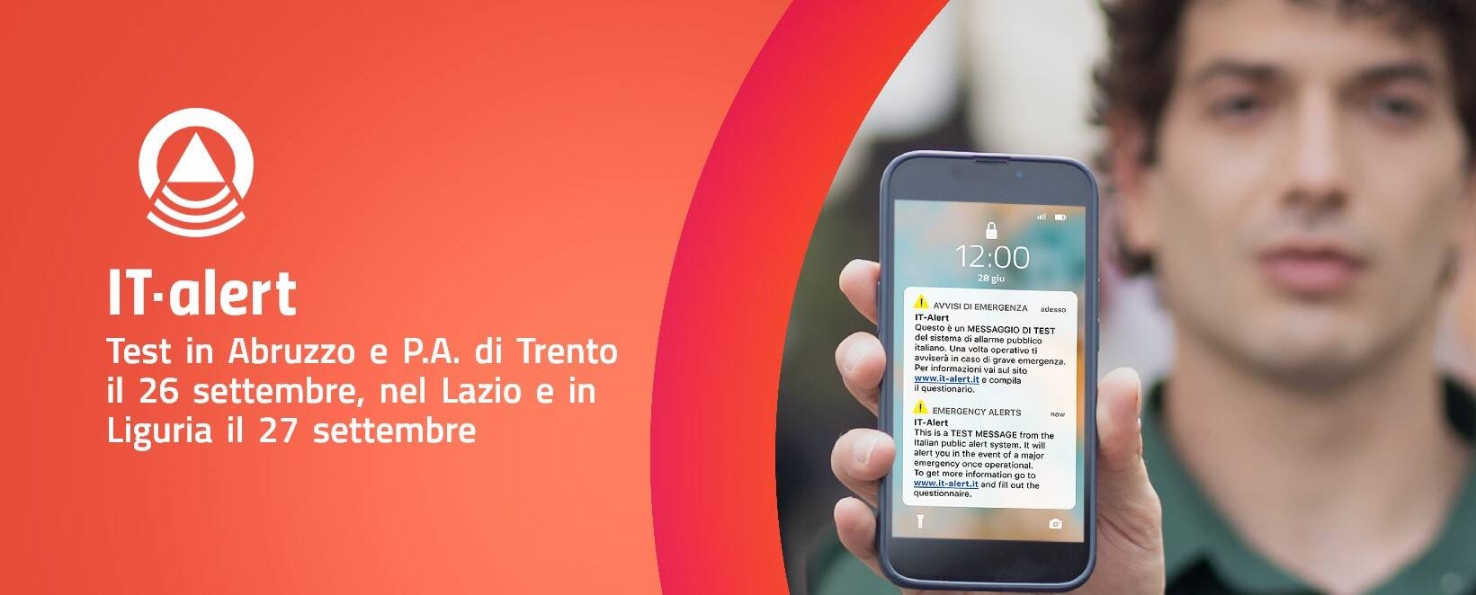 Intorno alle ore 12 di martedì 26 settembre, sui cellulari accesi e con connessione telefonica di coloro che si troveranno in Abruzzo, nella Provincia Autonoma di Trento e nelle aree limitrofe, arriverà un messaggio di test IT-alert. Il test si ripeterà il giorno successivo, mercoledì 27 settembre, con le stesse modalità e alla stessa ora in Lazio e Liguria. Il test nel Lazio era stato inizialmente programmato per il 21 settembre ma è stato rinviato per l’allerta gialla per temporali prevista sulla regione in quella giornata.