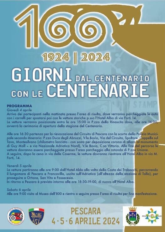 - Ore 16.30: partenza da Piazza Duca per la rievocazione del Circuito di Pescara. Nel tragitto è prevista una tappa a Montesilvano per la deposizione di una corona di alloro al monumento di Guy Moll di via Vestina.
