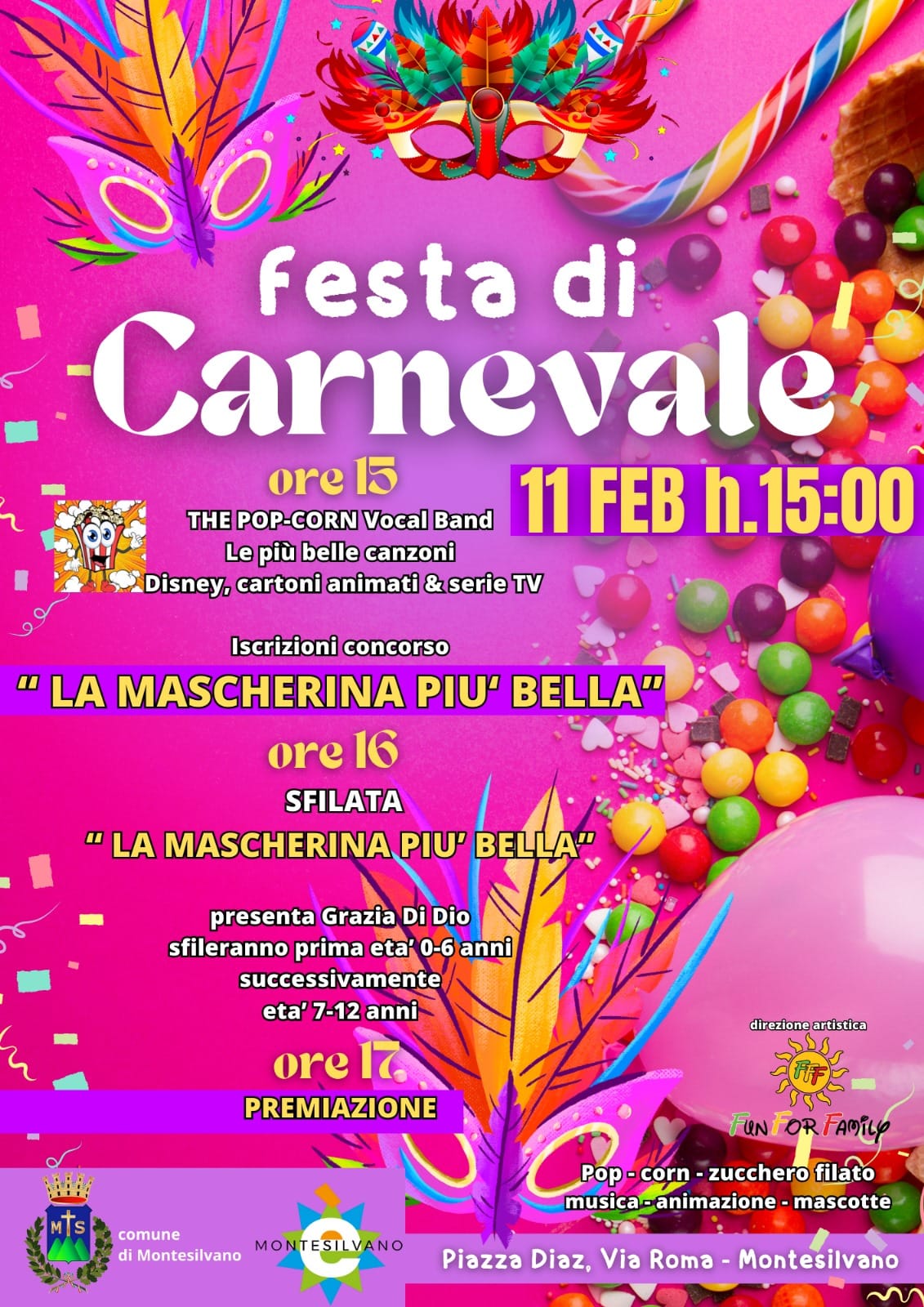 A Montesilvano è in arrivo la Festa più divertente dell'anno! DOMENICA 11 FEBBRAIO, TORNA IL CARNEVALE IN CITTA’ CON L’ ATTESISSIMO CONCORSO DELLA MASCHERINA PIU’ BELLA! A partire dalle ore 15 - in Piazza Diaz e su via Roma - esploderà il divertimento! Dalle ore 15, potrai iscrivere il tuo bambino al concorso “La mascherina più bella” e farlo partecipare alla sfilata che si terrà a partire dalle ore 16 su via Roma. Scegli la tua categoria: i primi a sfilare saranno i bimbi dai 0 ai 6 anni e, a seguire, quelli dai 7 ai 12 anni! Dalle ore 15 alle 16 - Un fantastico intrattenimento con "The Pop Corn vocal band”! Attraverso le voci di tre artisti abruzzesi, la band farà vivere a tutti i presenti, bambini e adulti, un viaggio nel tempo in chiave musicale con le più belle canzoni Disney, Cartoni Animati e sigle TV. Ore 17 – Premiazioni del Concorso “La mascherina più bella” per entrambe le categorie! Ad aspettarvi, un coloratissimo pomeriggio all’insegna dell’animazione targata Fun For Family!