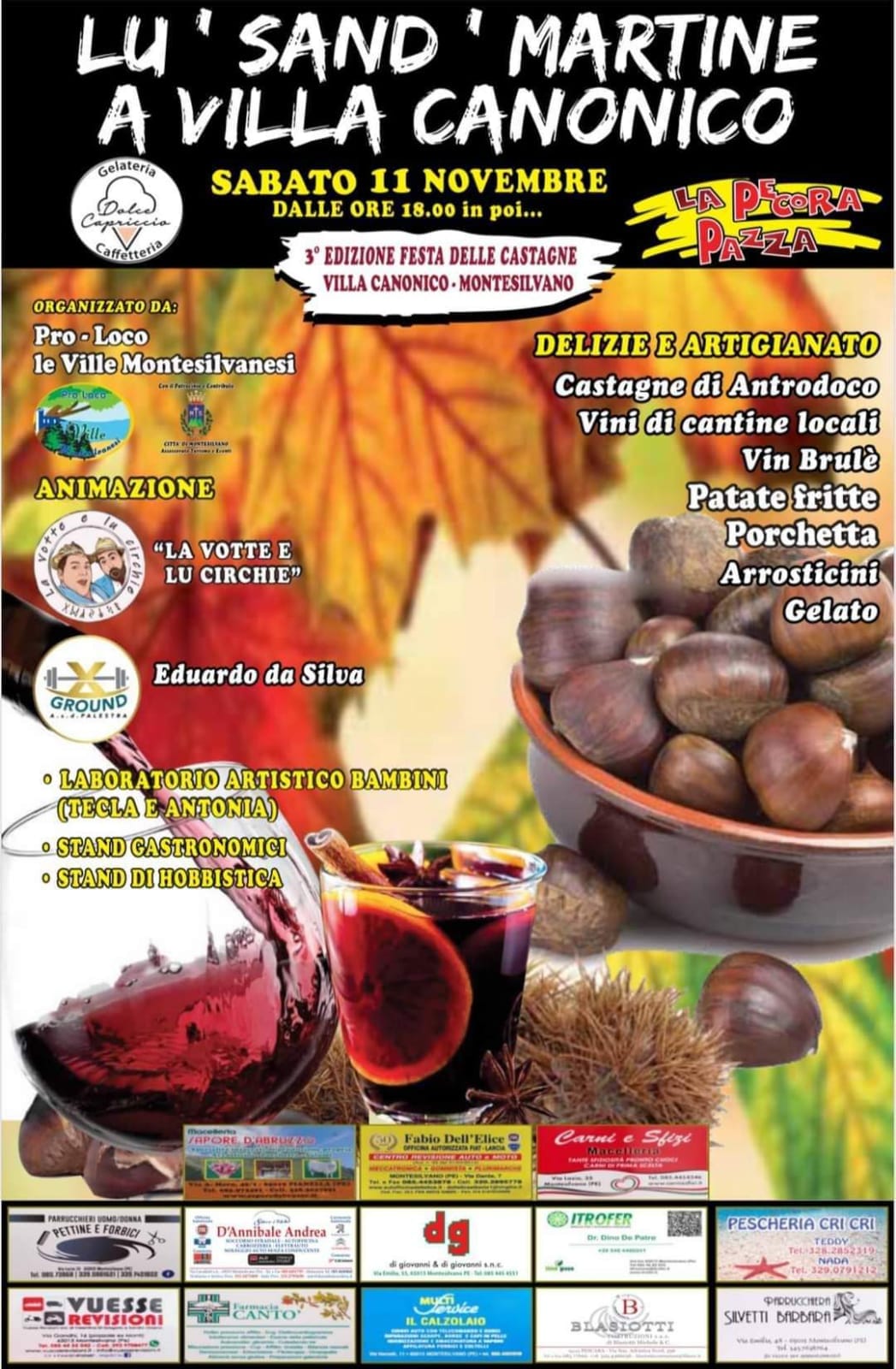 Con il patrocinio del Comune di Montesilvano, sabato 11 novembre dalle ore 18, non perdere “Lu’ Sand’ Martine a Villa Canonico. Organizzato dalla Pro Loco “Le Ville Montesilvanesi”, viale Abruzzo si animerà di stand gastronomici e stand di hobbistica, di un laboratorio artistico per bambini, animazione e tante delizie da degustare.