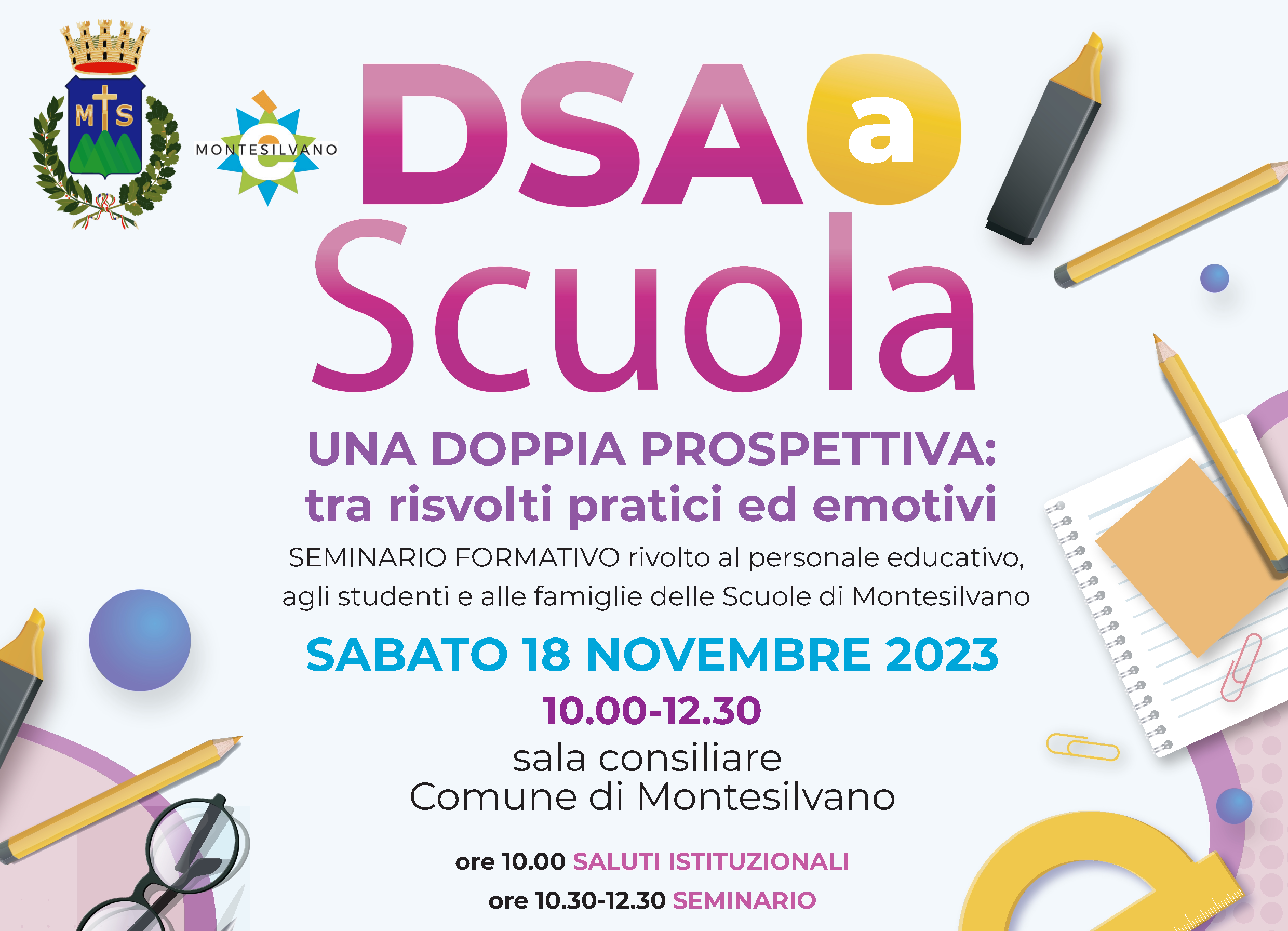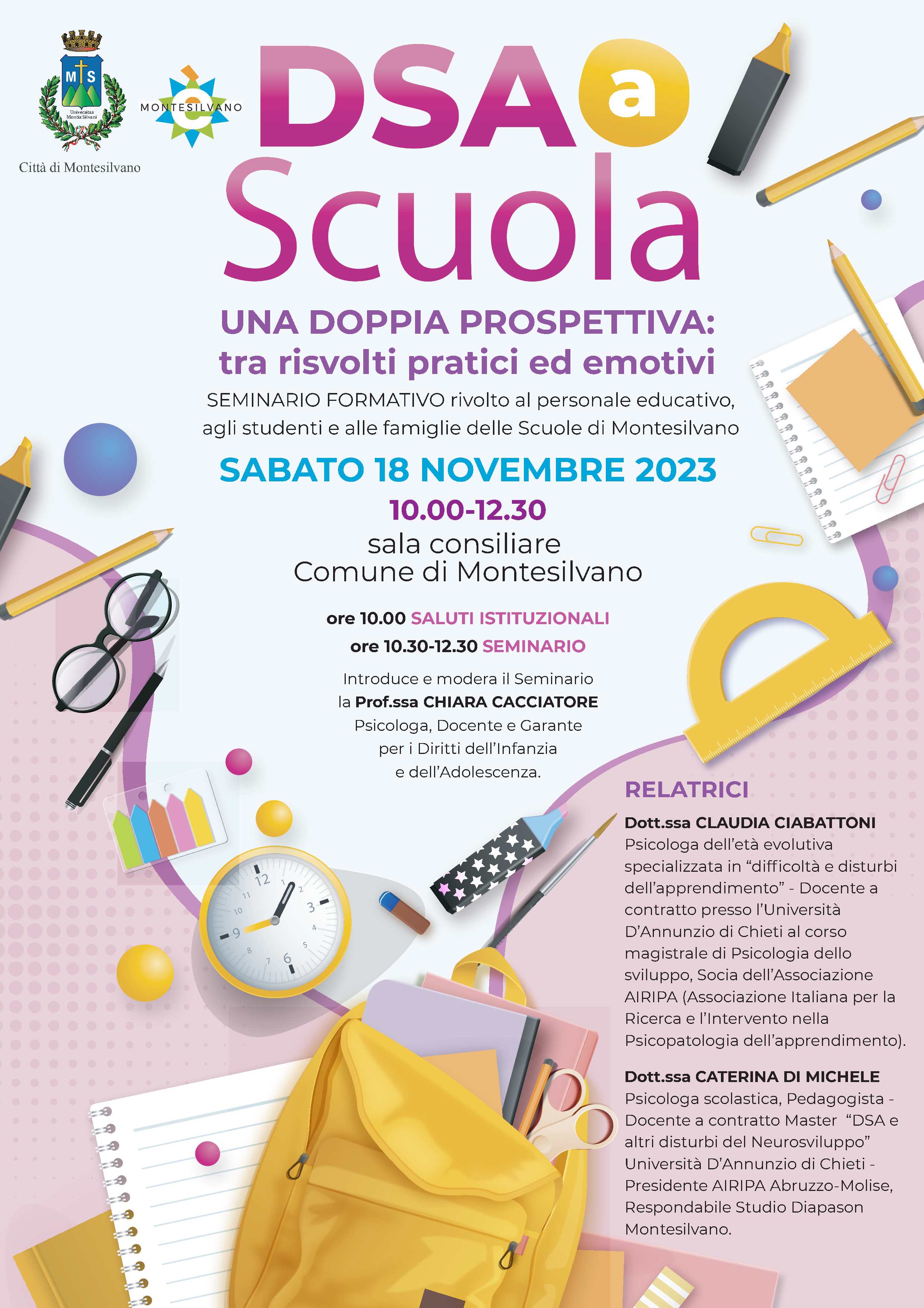 Il 18 novembre 2023 si terrà il seminario formativo "DSA a scuola" da parte del Garante dei Diritti dell'Infanzia e dell'Adolescenza, Dott.ssa Chiara Cacciatore.